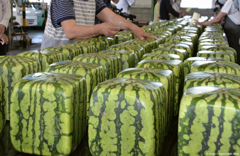 ويتم إنتاج هذا البطيخ على شكل مكعبات مساحتها حوالي 18 سنتيمتراً من خلال زراعته في حاويات بلاستيكية شفافة مع إطارات حديدية تسمح بدخول أشعة الشمس الكافية.