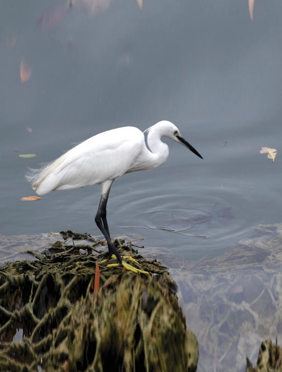 البلشون الأبيض ينظر إلى سمكة تسبح بالقرب من حديقة باسير ريس في سنغافورة. ا ف ب