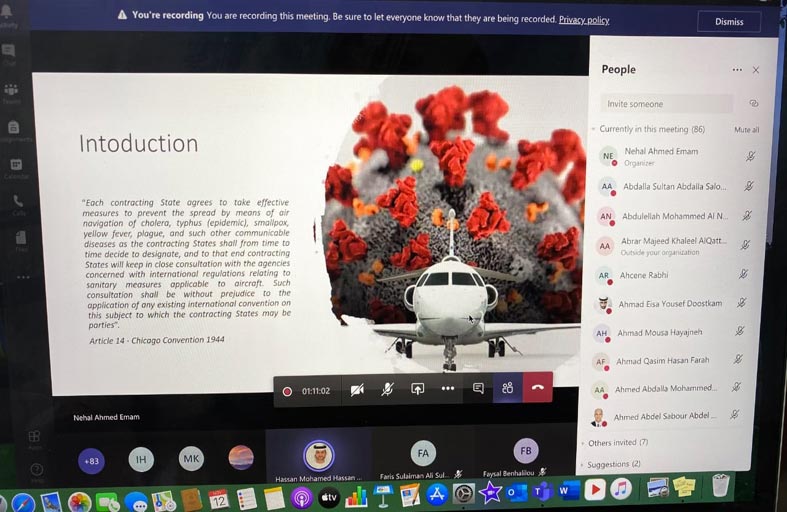 وتناولت الورقة الأولى والتي جاءت تحت عنوان "تأثيرات كوفيد-19 على النقل الجوي للبضائع – المستقبل المأمول"، وقدمتها أستاذة القانون الجوي المساعد في البرنامج الدكتورة إيمان نابوش، عن تأثر النقل الجوي للبضائع كغيره من بقية الخدمات بفيروس كوفيد-19 وأشارت إلى ضرورة إعفاء هذا النقل من القيود المطبقة من قبل بعض الدول في ضوء إصدار المنظمات الدولية المعنية لمجموعة من التوصيات الرامية لضمان استمرار النقل الجوي للبضائع بأمان وبما يمنع انتشار الفيروس، وفي الورقة الثانية والتي قدمها فريق مميز من طلبة البرنامج تم بحث الآثار القانونية والعملية لـ كوفيد - 19 على صناعة الطيران، بينوا فيها الأبعاد القانونية لهذه الجائحة وتأثيرها على قطاع الطيران، وأشاروا لأهمية إنشاء منظمة الطيران المدني الدولي لفرقة عمل معنية بانتعاش الطيران لتحديد الأولويات والسياسات الاستراتيجية للدول والجهات العاملة في هذا القطاع.