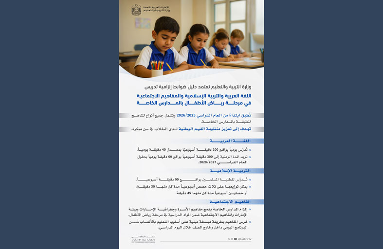 أعلنت وزارة التربية والتعليم اعتماد دليل ضوابط إلزامية تدريس اللغة العربية، والتربية الإسلامية، والمفاهيم الاجتماعية لمرحلة رياض الأطفال على مستوى المدارس الخاصة بالدولة، على أن يتم تطبيقها اعتباراً من العام الدراسي 2025-2026، وتشمل جميع أنواع المناهج التعليمية المعتمدة لدى المدارس الخاصة.تهدف هذه الخطوة إلى تعزيز منظومة القيم الوطنية لدى الطلبة منذ سن مبكرة، وتنشئة جيل متمسك بهويته الوطنية، متمكّن من لغته الأم، ومتشبع بمفاهيم الأسرة والمجتمع والجغرافيا الوطنية.تأتي هذه الخطوة تماشياً مع رؤية الوزارة الرامية إلى تعزيز الهوية الوطنية من خلال دعم تعليم اللغة العربية والتربية الإسلامية والمفاهيم الاجتماعية منذ المراحل التأسيسية الأولى، عبر تطوير وتنفيذ برامج تعليمية متخصصة تسهم في تنمية مهارات الأطفال في مجالات القراءة والكتابة والقيم الإماراتية والهوية الإماراتية وغيرها في سن مبكرة، بما يحقق مستهدفات تربوية تدعم الطلبة في مراحل تعليمهم اللاحقة.وستوفر الوزارة أطر التعلم الإرشادية اللازمة متضمنةً مخرجات التعلم الخاصة بالمواد الثلاث لكافة المدارس الخاصة قبل بدء العام الدراسي 2025-2026، بما يدعم توحيد التطبيق وتحقيق الهدف المرجو في المدارس الخاصة كافة.