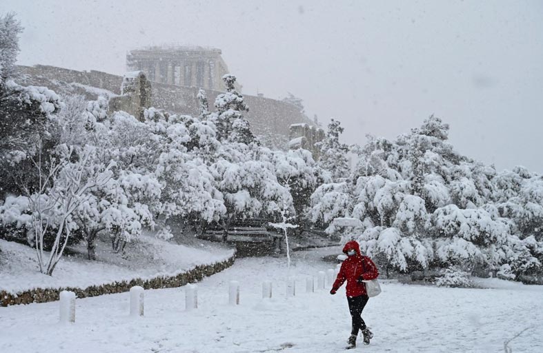 غطت الثلوج أمس الثلاثاء معلم أكروبوليس الشهير وغيره من المواقع الأثرية في أثينا، فخرجت إلى العالم بمشاهد استثنائية من اليونان التي تشهد حاليا موجة صقيع تسببت بشلل كبير في وسائل النقل.