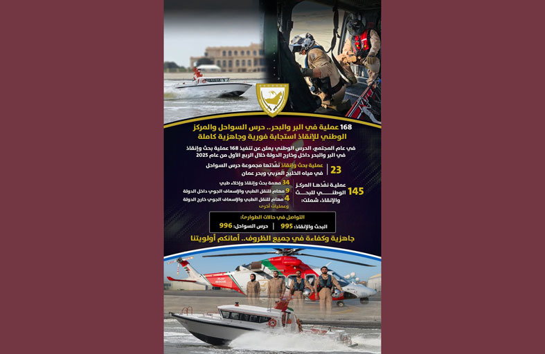 أعلنت قيادة الحرس الوطني عن تنفيذ 168 عملية بحث وإنقاذ في البر والبحر، داخل الدولة وخارجها، خلال الربع الأول من عام 2025، (من 1 يناير إلى 31 مارس)، في إطار جهود الحرس الوطني المتواصلة لتعزيز الاستجابة الفورية للطوارئ والحوادث، في “عام المجتمع”. ونفذت مجموعة حرس السواحل 23 عملية بحث وإنقاذ في مياه الخليج العربي وبحر عُمان، خلال الربع الأول من عام 2025، فيما نفذ المركز الوطني للبحث والإنقاذ 145 عملية خلال الفترة ذاتها، تضمنت 34 عملية بحث وإنقاذ طبي بالتعاون مع الجهات المختصة، و9 عمليات نقل طبي وإسعاف جوي داخل الدولة، و4 عمليات مماثلة خارج الدولة، وعمليات أخرى. وأكدت قيادة الحرس الوطني أن هذه العمليات تُجسد التزامها بتقديم خدمات عالية الكفاءة في عام المجتمع، وذلك باستخدام أحدث التقنيات والمعدات، لضمان سلامة الأرواح والتدخل السريع في مختلف الظروف والمناطق الجغرافية، داعية الجمهور إلى التواصل مع خط طوارئ البحث والإنقاذ على الرقم (995)، وخط طوارئ حرس السواحل على الرقم (996) للإبلاغ عن أي حالات طارئة تستدعي المساعدة أو التدخل الفوري.
