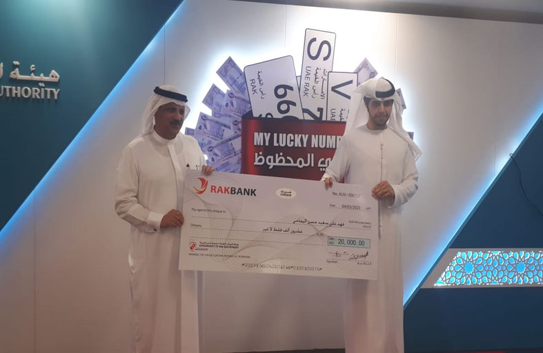 سلم جمال أحمد الطير رئيس مجلس إدارة هيئة الموارد العامة في رأس الخيمة المواطن فهد علي سعيد اليماحي – 22 عاما - الفائز الثالث بمبادرة رقمي المحظوظ الشهرية شيكا بمبلغ 20 ألف درهم .