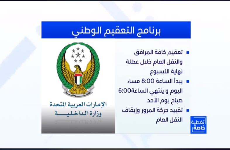 أوضحت وزارة الداخلية أن تنفيذ برنامج التعقيم الوطني المزمع تطبيقه خلال عطلة نهاية الأسبوع إبتداءً من مساء أمس الخميس الموافق 26 مارس سيتم يوميا في الفترة من الساعة الثامنة مساءً ولغاية السادسة صباح اليوم التالي، على أن تستمر حركة النقل والجمهور بشكل طبيعي في النهار ويتم تقييد الحركة يوميا في الفترة المسائية من الساعة 8 مساء حتى الساعة 6 صباح اليوم التالي.
