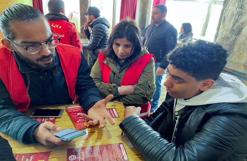 في يوم بارد وممطر قريب من جامعة المنار بتونس، أقام مجموعة من المتطوعين الموالين لسعيد كشكًا على شرفة مقهى مع لافتات ومكبرات صوت لتشجيع الناس على التسجيل في الاستبيان لكن بدا أن عدد المهتمين قليل للغاية.