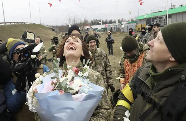 قرب نقطة تفتيش في كييف اصطف جنود أوكرانيون للاحتفال بزفاف ليسيا إيفاشينكو، عضو في قوات الدفاع الإقليمية الأوكرانية إلى على يد نائب قائد كتيبتها، فاليري فيليمونوف فيما تتلاحق الأخبار التي توثق القصف الروسي على مواقع الجيش في كييف.