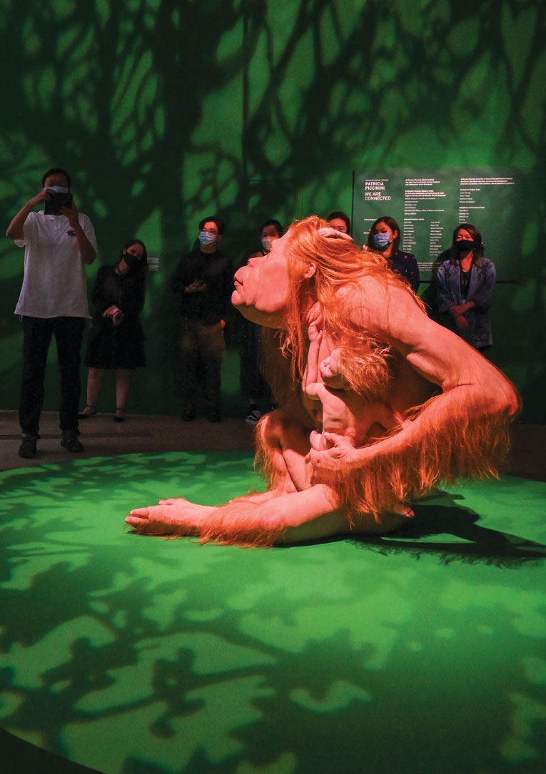الزوار يلتقطون صورا للنحت المسمى «عاطفة غريبة» خلال العرض الصحفي لمعرض الفنانة الأسترالية باتريشيا بيتشينيني في متحف العلوم والفنون في سنغافورة. ا ف ب