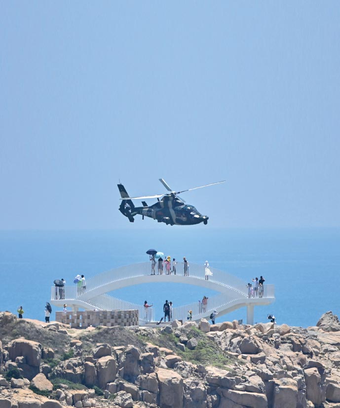 السائحون ينظرون إلى طائرة هليكوبتر عسكرية صينية تحلق فوق جزيرة بينغتان، وهي أقرب نقطة في البر الرئيسي للصين من تايوان، ضمن مناورات ضخمة قبالة تايوان بعد زيارة نانسي بيلوسي إلى الجزيرة. ا ف ب