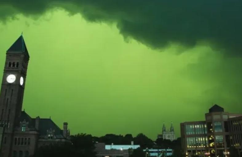 وقالت صحيفة "ديلي ميل" البريطانية إن سكان سو فولز، كبرى مدن الولاية شعروا وكأنهم في مسلسل "أمور غريبة"، عندما انقلب لون السماء إلى الأخضر الداكن.