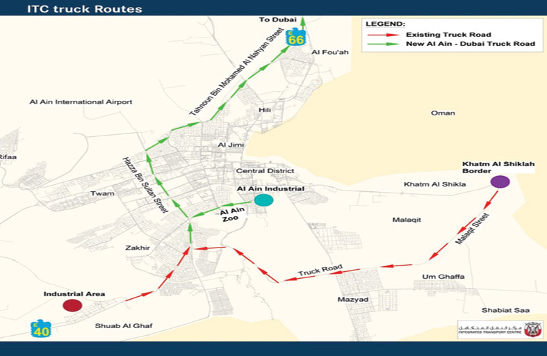أعلن مركز النقل المتكامل، بالتعاون مع بلدية مدينة العين والقيادة العامة لشرطة أبوظبي، في أواخر يوليو الماضي عن السماح للشاحنات باستخدام طريق العين – دبي "E66" خارج أوقات الذروة من الساعة 10:00 مساءً وحتى الساعة 6:00 صباحًا وذلك بهدف تعزيز حركة نقل البضائع بالشاحنات بين إمارات الدولة.