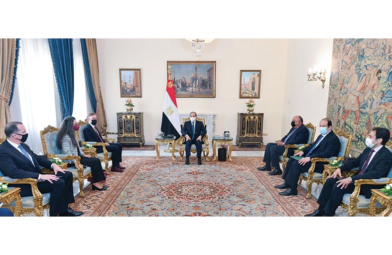 وخلال لقائه مع وفد من مجلس الأمن القومي الأميركي، الذي يضم جيك سوليفان وبريت ماكجورك وأريانا برينجورت وجوشوا هاريس، بحث الرئيس السيسي مستجدات قضية سد النهضة في ضوء صدور البيان الرئاسي الأخير لمجلس الأمن وما تضمنه من ضرورة امتثال الأطراف للتوصل لاتفاق ملء وتشغيل ملزم قانوناً خلال فترة وجيزة.