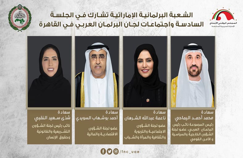 ويضم الوفد أعضاء مجموعة الشعبة البرلمانية الإماراتية في البرلمان العربي سعادة كل من محمد أحمد اليماحي رئيس المجموعة نائب رئيس البرلمان العربي عضو لجنة الشؤون الخارجية والسياسية والأمن القومي، وناعمة عبدالله الشرهان النائب الثاني لرئيس المجلس عضو لجنة الشؤون الاجتماعية والتربوية والثقافية والمرأة والشباب، وأحمد بوشهاب السويدي عضو لجنة الشؤون الاقتصادية والمالية، وشذى سعيد النقبي نائب رئيس لجنة الشؤون التشريعية والقانونية وحقوق الإنسان.