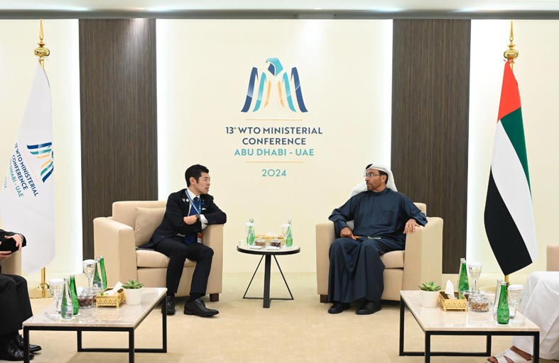 التقى معالي أحمد بن علي الصايغ وزير دولة معالي تسوجي كيوتو وزير الدولة للشؤون الخارجية في اليابان، وذلك على هامش المؤتمر الوزاري الثالث عشر لمنظمة التجارة العالمية الذي يعقد في أبوظبي حاليا. جرى خلال اللقاء بحث علاقات التعاون الاقتصادي والتجاري وما تشهده من تطور مستمر في ضوء الروابط الوثيقة بين البلدين الصديقين، وسبل تعزيزه في المجالات الثنائية ومتعددة الأطراف.