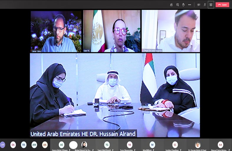 جاء ذلك خلال لقائه سعادة فرانسيسكا اليزابيث ميندس ايسكوبار سفيرة الولايات المتحدة المكسيكية لدى الدولة عبر الإتصال المرئي بحضور الدكتورة ندى حسن أحمد المرزوقي مديرة إدارة الطب الوقائي والدكتورة ليلى الجسمي رئيسة قسم التحصين وممثلين عن وزارة الخارجية ووزارة الصحة المكسيكية.