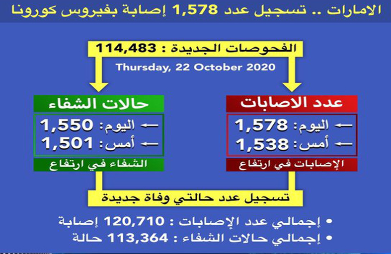 وساهم تكثيف إجراءات التقصي والفحص في الدولة وتوسيع نطاق الفحوصات على مستوى الدولة في الكشف عن 1,578 حالة إصابة جديدة بفيروس كورونا المستجد من جنسيات مختلفة، وجميعها حالات مستقرة وتخضع للرعاية الصحية اللازمة، وبذلك يبلغ مجموع الحالات المسجلة 120,710حالات.