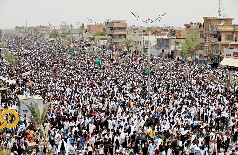 بدون أن يكون حاضراً، جمع زعيم التيار الصدري رجل الدين الشيعي مقتدى الصدر مئات الآلاف من مؤيديه في صلاة موحدة الجمعة في بغداد، في خطوة تهدف إلى الضغط على خصومه السياسيين والدفع باتجاه تشكيل حكومة وسط أزمة سياسية معقّدة تمرّ بها البلاد.