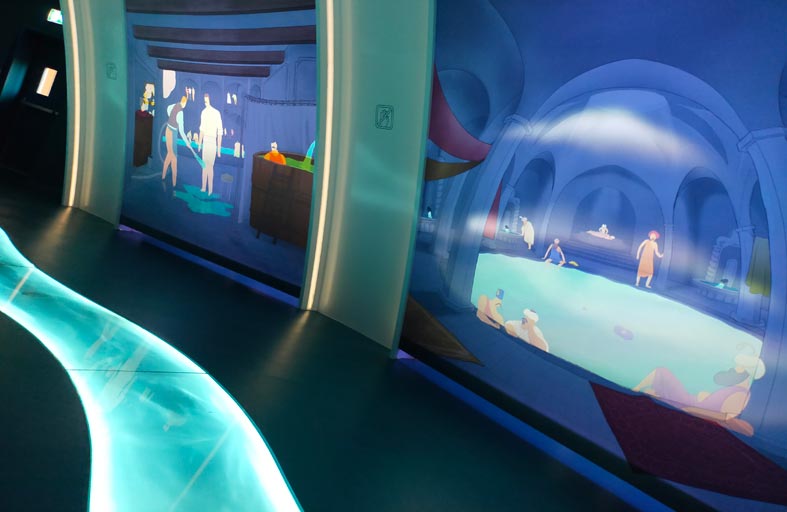 والجولة داخل الجناح تبدأ بمسار أزرق مضيئ يأخذ الزائر في رحلة عبر ينابيع حرارية فريدة، ومن بينها ينابيع كهف ميشكولتستابولك، ثم يزور عددا من المنتجعات الصحية الكبيرة ويمكنه التوقف في منطقة "أكوا بار" لتناول رشفة من مياه هنغاريا المعدنية الشهيرة.