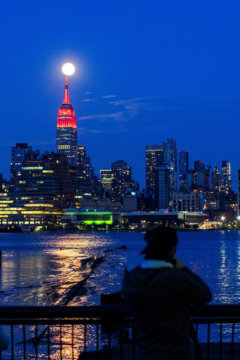 القمر يضيء خلف مبنى إمباير ستيت بينما يضيء المبنى باللون الأحمر للتضامن مع المصابين بفيروس كورونا في حي مانهاتن بمدينة نيويورك. رويترز