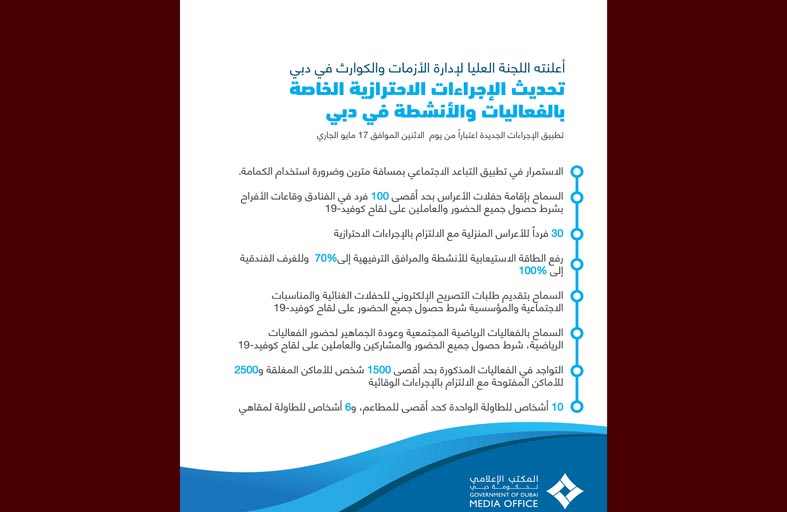 وفيما يخص الفعاليات والمناسبات، فقد اعتمدت اللجنة العليا السماح بتقديم طلبات التصريح الإلكتروني للحفلات الغنائية والمناسبات الاجتماعية والمؤسسية، بالإضافة إلى السماح بالفعاليات الرياضية المجتمعية وعودة الجماهير لحضور الفعاليات الرياضية، شرط أن يكون جميع الحضور والمشاركين والعاملين من الحاصلين على لقاح "كوفيد-19" والالتزام بـ 70 في المائة من الطاقة الاستيعابية للمكان على ألا يتعدى العدد 1500 شخص للأماكن المغلقة و2500 للأماكن المفتوحة، ويتم ذلك لفترة تجريبية تمتد لشهر واحد قابلة للتمديد اعتباراً من اليوم الإثنين /17 مايو/. وشددت اللجنة العليا لإدارة الأزمات والكوارث في دبي على ضرورة التقيّد الكامل بالتدابير الاحترازية والإجراءات الوقائية المُعلنة، حيث ستتولى جميع الجهات التي لها السلطة الرقابية والتفتيشية في الإمارة التأكد من تطبيق هذه الإجراءات الاحترازية، كما سيتم متابعة وتقييم الوضع بشكل مستمر بالتعاون مع مركز التحكم والسيطرة لمكافحة فيروس كورونا في دبي، لاتخاذ اللازم في ضوء هذا التقييم، في حين سيتم اتخاذ كافة الإجراءات القانونية اللازمة تجاه المخالفين.
