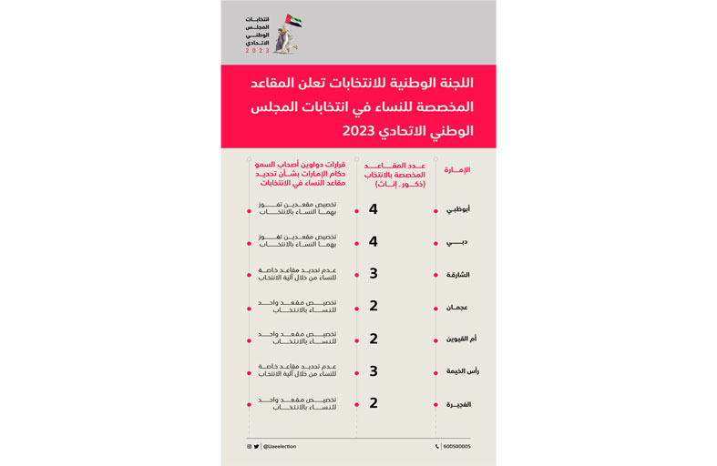 أعلنت اللجنة الوطنية للانتخابات عن المقاعد المخصصة للنساء في انتخابات المجلس الوطني الاتحادي 2023، وذلك بعد تسلمها من دواوين أصحاب السمو الشيوخ أعضاء المجلس الأعلى للاتحاد حكام الإمارات، ووفقاً للآليات التي وردت في القرار رقم (1) لسنة 2019 الذي أصدره المغفور له- بإذن الله تعالى- الشيخ خليفة بن زايد آل نهيان "رحمه الله" برفع نسبة تمثيل النساء في المجلس الوطني الاتحادي إلى 50%. ووفقاً للآلية الاختيارية التي وردت في القرار؛ فإن اللجنة الوطنية للانتخابات تعلن موقف دواوين أصحاب السمو الشيوخ أعضاء المجلس الأعلى للاتحاد حكام الإمارات من تحديد المقاعد التي تفوز بها النساء عند انتخاب ممثلي الإمارة في المجلس الوطني الاتحادي. حيث حددت إمارتا أبوظبي ودبي مقعدين للنساء من المقاعد المخصصة لكل إمارة بالانتخاب. أما إمارتي الشارقة ورأس الخيمة فلم تحدد أية مقاعد للنساء من خلال آلية الانتخاب، في حين حددت إمارات عجمان والفجيرة وأم القيوين مقعداً واحداً للنساء بالانتخاب من المقعدين المخصصين لكل إمارة. وبناء على القرار فإن إمارتي الشارقة ورأس الخيمة ستستخدمان أسلوب التعيين لإتمام نسبة الـ50% من عضوية النساء في المجلس الوطني الاتحادي، في حين ستستخدم بقية الإمارات أسلوب الجمع بين الانتخاب والتعيين لاستكمال نسبة الـ50 % من المقاعد المخصصة للنساء في تشكيل المجلس الوطني الاتحادي.