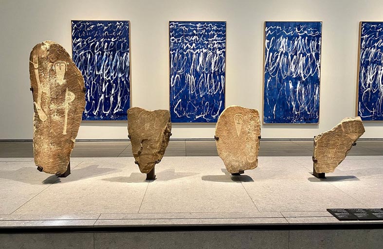 •    مزهرية مزينة بزخارف هندسية من بلاد الرافدين، ويعود تاريخها إلى عام 5500 قبل الميلاد، ختم تاجر من دلمون، وإفريز الجص من دير صير بني ياس المسيحي الذي يضم الصليب المسيحي ويعود تاريخه إلى الفترة ما بين 500 إلى 800 ميلادية، من دائرة الثقافة والسياحة - أبوظبي؛