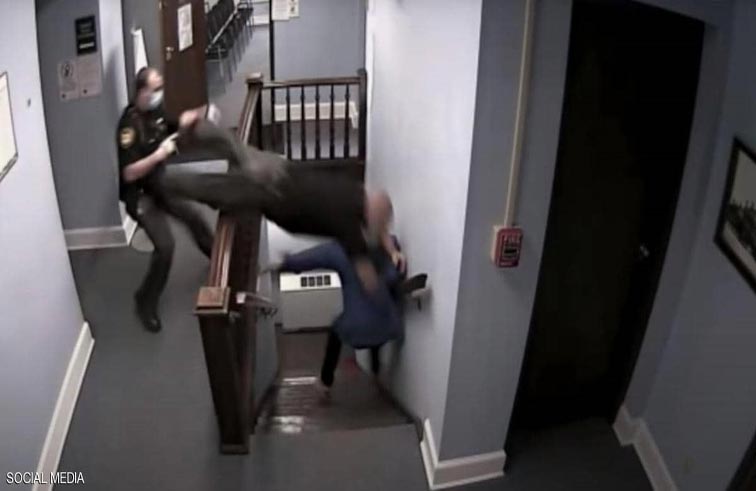 وخلال وصوله إلى الدرج، حاول شرطي القفز بطريقة انتحارية على الهارب لقطع الطريق عليه، لكنه فشل في عمليته وتدحرج على درجات السلم وبدا أنه غير قادر على التحرك.
