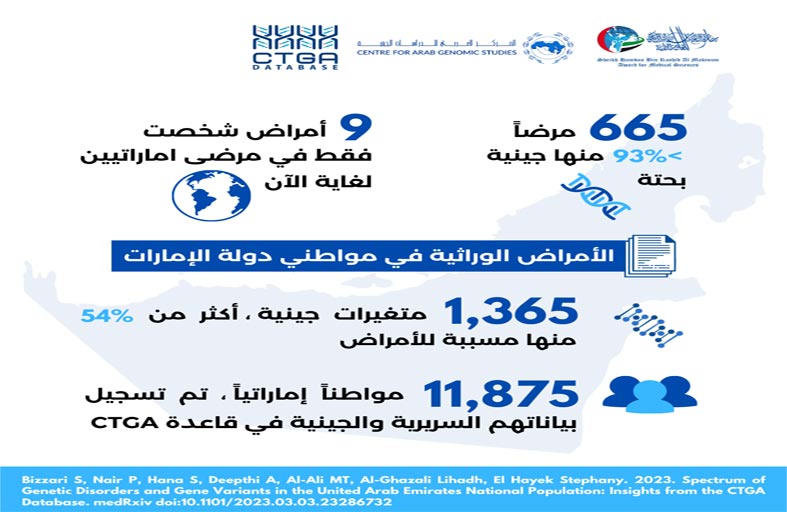 وتشكل هذه الورقة البحثية أول مراجعة وتحليل لجميع الاضطرابات الجينية والمتغيرات الجينية المبلغ عنها من المواطنين الإماراتيين والمستضافة في كتالوج علم الوراثة لدى العرب التابع للمركز "CTGA"وهي قاعدة بيانات مفتوحة الوصول تجمع بيانات ببليوغرافية عن المتغيرات الجينية البشرية المرتبطة بالاضطرابات الجينية لدى العرب.