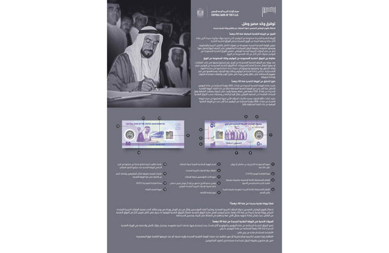 وكان مصرف الإمارات المركزي قد أطلق مؤخرا ورقة نقدية جديدة من فئة الــ 50 درهماً بمناسبة عيد الاتحاد الـ 50 ..وذلك تخليداً لمآثر المغفور له المؤسس الشيخ زايد بن سلطان آل نهيان والرعيل الأول من حكام دولة الإمارات «طيب الله ثراهم أجمعين» ووفاء لتفانيهم وعرفاناً بدورهم التاريخي في توحيد الدولة تحت راية واحدة.
