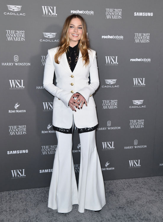 الممثلة الأسترالية مارجوت روبي لدى وصولها لحضور حفل جوائز وول ستريت جورنال 2022 في مدينة نيويورك - ا ف ب