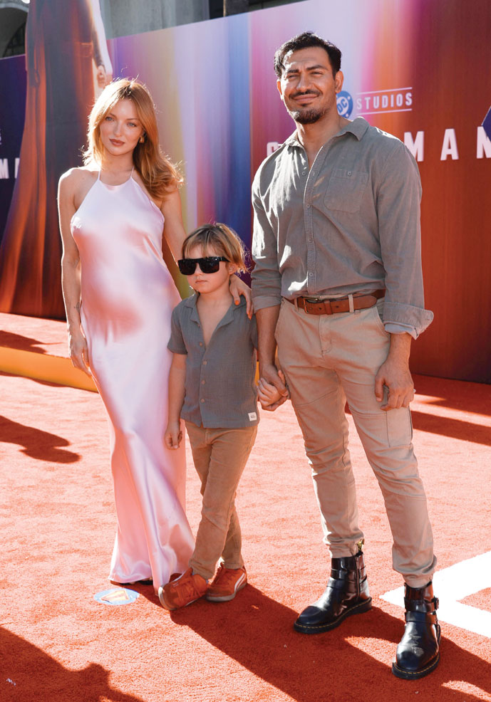 الممثلة الأمريكية فرانشيسكا إيستوود والممثل ألكسندر رايث وابنهما تايتان يحضرون العرض الأول لفيلم «سوبرمان» في لوس أنجلوس. ا ف ب