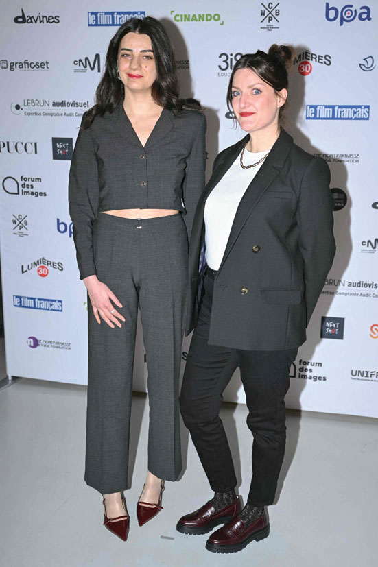 الممثلة السورية هالة رجب مع المخرجة الفرنسية فلورنس روشات خلال جلسة التصوير الخاصة بحفل توزيع جوائز السينما الـ 28  Ceremonie des lumieres  في باريس. (ا ف ب)
