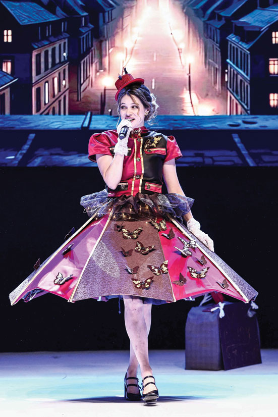 الممثلة الفرنسية فلورنس كوست تؤدي على خشبة المسرح مرتدية زيًا من الشوكولاتة خلال العرض الموسيقي «عرض الكاكاو» في باريس 2025 - ا ف ب