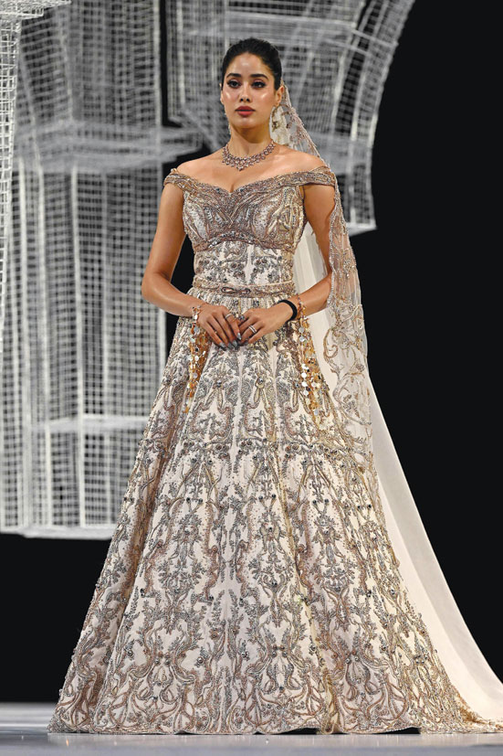 الممثلة الهندية جانفي كابور لدى حضورها عرض أزياء الزفاف الراقية للمصمم جاوراف جوبتا في مومباي. ا ف ب