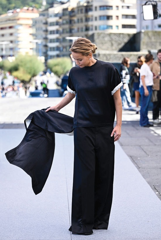 الممثلة والمنتجة الأمريكية جينيفر لورانس تلتقط صوراً قبل ساعات من حصولها على جائزة دونوستيا تقديراً لمسيرتها السينمائية خلال مهرجان سان سيباستيان السينمائي في إسبانيا. ا ف ب