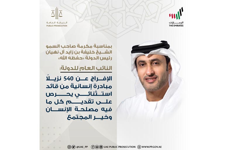 النائب العام للدولة: مكرمة رئيس الدولة بالإفراج عن 540 نزيلا مبادرة إنسانية من قائد استثنائي