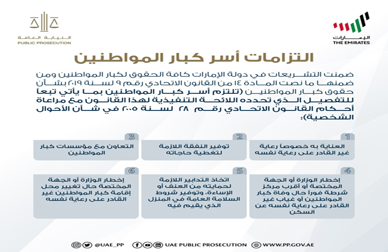 وأشارت النيابة العامة إلى أنه طبقا للمادة 14 من القانون الاتحادي رقم 9 لسنة 2019 في شأن حقوق كبار المواطنين ، أنه مع مراعاة أحكام القانون الاتحادي رقم 28 لسنة 2005 في شأن الأحوال الشخصية ، تلتزم أسر كبار المواطنين بما يأتي تبعاً للتفصيل الذي تحدده اللائحة التنفيذية لهذا القانون: 1- العناية به خصوصاً رعاية غير القادر على رعاية نفسه.
