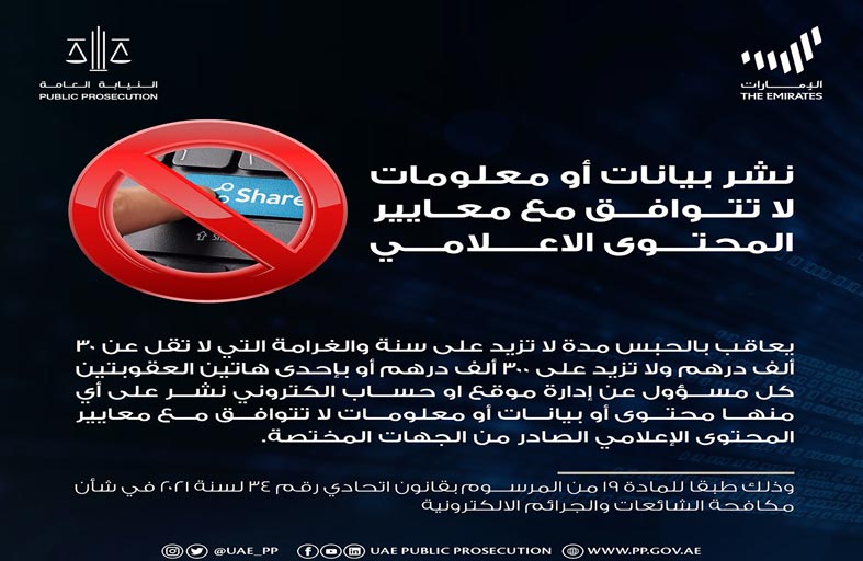 أوضحت النيابة العامة للدولة، من خلال تغريدة نشرتها امس على حساباتها في مواقع التواصل الاجتماعي جريمة نشر بيانات أو معلومات لا تتوافق مع معايير المحتوى الإعلامي. وأشارت النيابة العامة إلى أنه طبقا للمادة 19 من المرسوم بقانون اتحادي رقم 34 لسنة 2021 في شأن مكافحة الشائعات والجرائم الالكترونية.. يعاقب بالحبس مدة لا تزيد على سنة والغرامة التي لا تقل عن 30 ألف درهم ولا تزيد على 300 ألف درهم أو بإحدى هاتين العقوبتين كل مسؤول عن إدارة موقع أو حساب الكتروني نشر على أي منها محتوى أو بيانات أو معلومات لا تتوافق مع معايير المحتوى الإعلامي الصادر من الجهات المختصة. ويأتي نشر هذه المعلومات في إطار حملة النيابة العامة للدولة المستمرة لتعزيز الثقافة القانونية بين أفراد المجتمع ونشر جميع التشريعات المستحدثة والمحدثة بالدولة ، ورفع مستوى وعي الجمهور بالقانون، وذلك بهدف نشر ثقافة القانون كأسلوب حياة.