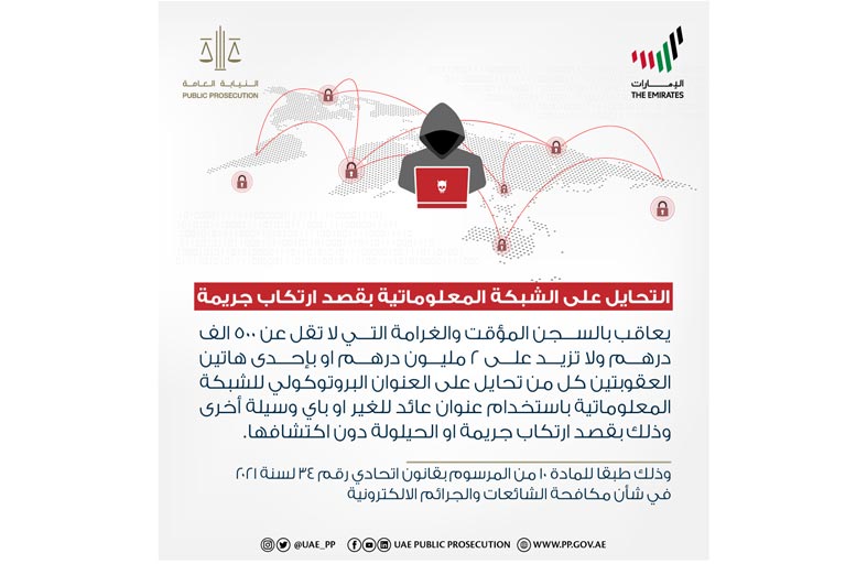 أوضحت النيابة العامة للدولة عقوبة التحايل على الشبكة المعلوماتية بقصد ارتكاب جريمة . وأشارت النيابة العامة من خلال تغريدة أمس على حساباتها في مواقع التواصل الاجتماعي إلى المادة 10 من المرسوم بقانون اتحادي رقم 34 لسنة 2021 في شأن مكافحة الشائعات والجرائم الالكترونية و التي نصت على أنه يعاقب بالسجن المؤقت والغرامة التي لا تقل عن 500,000 خمسمائة ألف درهم ولا تزيد على 2,000,000 مليوني درهم أو بإحدى هاتين العقوبتين كل من تحايل على العنوان البروتوكولي للشبكة المعلوماتية باستخدام عنوان عائد للغير أو بأي وسيلة أخرى، وذلك بقصد ارتكاب جريمة أو الحيلولة دون اكتشافها. يأتي نشر هذه المعلومات في إطار حملة النيابة العامة للدولة المستمرة لتعزيز الثقافة القانونية بين أفراد المجتمع ونشر جميع التشريعات المستحدثة والمحدثة بالدولة ، ورفع مستوى وعي الجمهور بالقانون، وذلك بهدف نشر ثقافة القانون كأسلوب حياة.