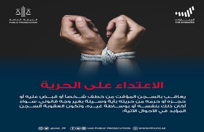 أوضحت النيابة العامة للدولة، من خلال تغريدة نشرتها امس على حساباتها في مواقع التواصل الاجتماعي عقوبات جرائم الاعتداء على الحرية. وأشارت النيابة العامة إلى أنه طبقا للمادة 395 من المرسوم بقانون اتحادي رقم 31 لسنة 2021 باصدار قانون الجرائم والعقوبات والتي نصت على أنه يعاقب بالسجن المؤقت من خطف شخصاً أو قبض عليه أو حجزه أو حرمه من حريته بأية وسيلة بغير وجه قانوني، سواءً أكان ذلك بنفسه أو بوساطة غيره، وتكون العقوبة السجن المؤبد في الأحوال الآتية: