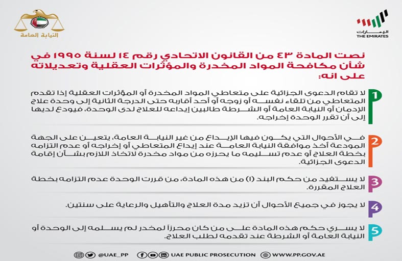 وقالت النيابة العامة في تغريدة قانونية نشرتها أمس على حساباتها في مواقع التواصل الاجتماعي" تويتر"، وفقاً للمادة 43 من القانون اتحادي رقم 14 لسنة 1995 في شأن مكافحة المواد المخدرة والمؤثرات العقلية، لا تقام الدعوى الجزائية على متعاطي المواد المخدرة أو المؤثرات العقلية إذا تقدم المتعاطي من تلقاء نفسه أو زوجه أو أحد أقاربه حتى الدرجة الثانية إلى وحدة علاج الإدمان أو النيابة العامة أو الشرطة طالبين إيداعه للعلاج لدى الوحدة، فيودع لديها إلى أن تقرر الوحدة إخراجه.