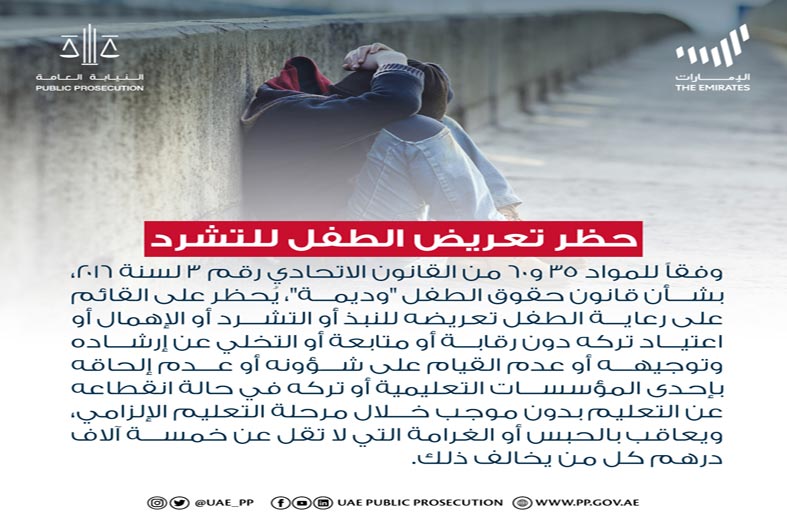 و نوهت النيابة العامة على حساباتها بمواقع التواصل الاجتماعي إلى أنه طبقا للمادة الـ 35 من قانون حقوق الطفل "وديمة" يحظر على القائم على رعاية الطفل تعريضه للنبذ أو التشرد أو الإهمال أو اعتياد تركه دون رقابة أو متابعة أو التخلي عن إرشاده وتوجيهه أو عدم القيام على شؤونه أو عدم إلحاقه بإحدى المؤسسات التعليمية أو تركه في حالة انقطاعه عن التعليم بدون موجب خلال مرحلة التعليم الإلزامي.. فيما نصت المادة 60 من ذات القانون على عقوبة من يخالف ذلك بالحبس أو الغرامة التي لا تقل عن خمسة آلاف درهم.