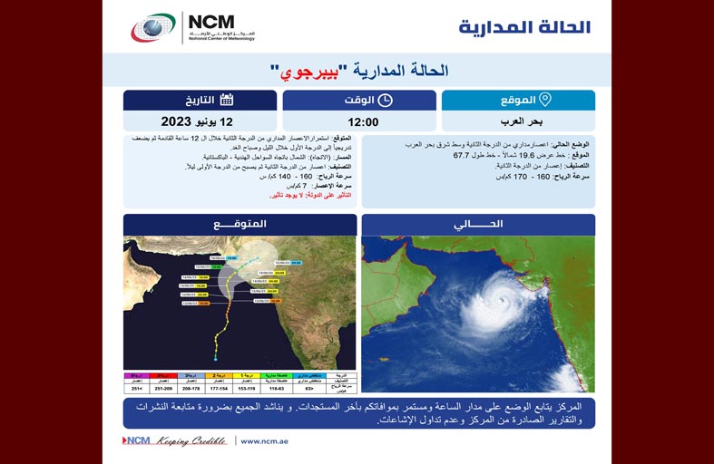أعلن المركز الوطني للأرصاد أن الحالة المدارية في بحر العرب تحولت إلى إعصار من الدرجة الثانية ، مؤكدا أنه لا يوجد أي تأثير على الدولة. وأوضح أن الإعصار يتمركز حاليا وسط شرق بحر العرب عند خط عرض 19.6 شمالاً ، و خط طول 67.7 ، وتبلغ سرعة الرياح حول المركز من 160 إلى 170 كم - الساعة مع وجود تشكيلات من السحب الركامية الممطرة حول المنخفض. وتوقع المركز من خلال النماذج العددية والتقارير الصادرة من مركز مراقبة الأعاصير الإقليمي، استمرار الإعصار المداري من الدرجة الثانية خلال الـ 12 ساعة القادمة ، ثم يبدأ في الضعف تدريجياً إلى الدرجة الأولى خلال الليل وصباح اليوم، والاتجاه للشمال نحو السواحل الهندية الباكستانية، حيث تتراوح سرعة الرياح حول المركز 140 – 160 كم - س وسرعة تحرك الإعصار 7 كم-س.