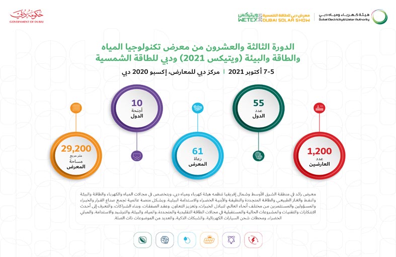 وجددت هيئة كهرباء ومياه دبي دعوتها للجمهور والمختصين وطلاب المدارس والجامعات لزيارة المعرض والتعرف إلى آخر التطورات وأحدث التقنيات في قطاعات المياه والطاقة التقليدية والمتجددة والبيئة والمشاركة في الندوات وورش العمل المتخصصة والجلسات النقاشية التي تنظم خلال المعرض بمشاركة خبراء ومختصين في مختلف مجالات الاقتصاد الأخضر والمدن الذكية والابتكار والتنمية المستدامة. وأكد معالي سعيد محمد الطاير العضو المنتدب الرئيس التنفيذي لهيئة كهرباء ومياه دبي رئيس ومؤسس معرض ويتيكس ودبي للطاقة الشمسية أن هذه الدورة من المعرض تشكل فرصة استثنائية للعارضين والزوار ليكونوا جزءاً من أول إكسبو دولي في منطقة الشرق الأوسط وأفريقيا وجنوب آسيا وأحد أوائل الفعاليات الكبرى في العالم منذ بدء جائحة “ كوفيد-19».