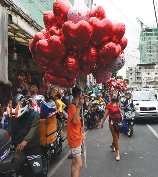 باعة يبيعون بالونات على شكل قلب للعملاء في شارع للزهور خلال عيد الحب في مانيلا - ا ف ب