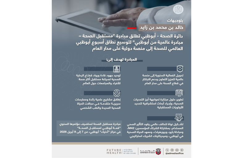 وستُتوَّج هذه الجهود بانعقاد قمة مستقبل الصحة في أبوظبي، التي ستُقام في مركز "أدنيك" أبوظبي، خلال الفترة من 7 إلى 9 أبريل 2026، لتكون الحدث السنوي الرئيسي، الذي يجمع القادة وصُنّاع القرار والخبراء من مختلف أنحاء العالم، في منصة تُجسّد التعاون العالمي من أجل مستقبل صحي أكثر استدامة.