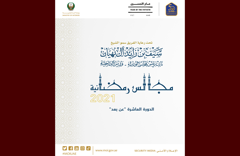 تحت رعاية الفريق سمو الشيخ سيف بن زايد آل نهيان نائب رئيس مجلس الوزراء وزير الداخلية، تنطلق مساء اليوم "الثلاثاء" مجالس وزارة الداخلية الرمضانية في دورتها العاشرة للعام 2021، التي تنظمها وزارة الداخلية عبر تقنيات الاتصال المرئي "عن بعد"، التزاماً بالإجراءات الاحترازية والوقائية للحد من انتشار فيروس "كوفيد 19".
