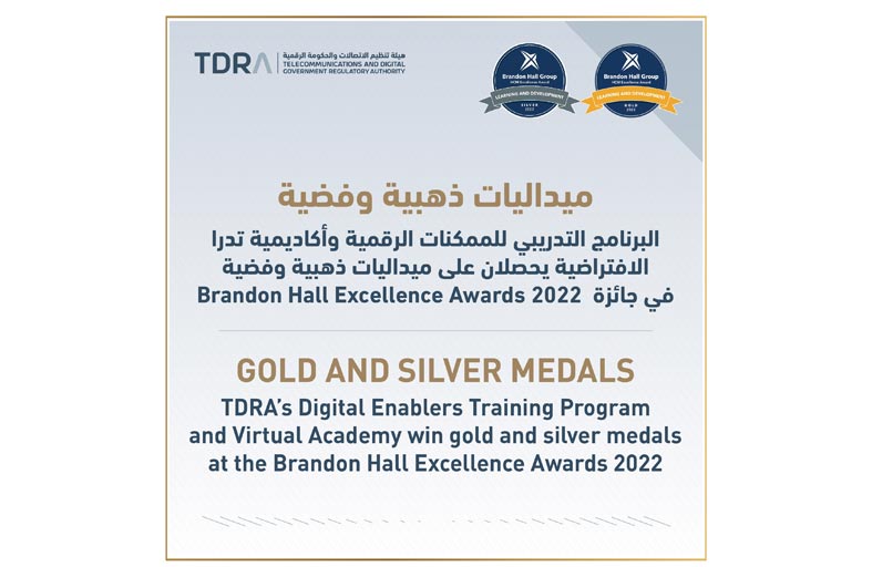 أعلنت هيئة تنظيم الاتصالات والحكومة الرقمية فوز البرنامج التدريبي للممكنات الرقمية واستراتيجية بناء القدرات والتوعية الرقمية بميداليات ذهبية وفضية في جوائز Brandon Hall 2022 ، حيث حصل البرنامج التدريبي للممكنات الرقمية على ميداليتين ذهبيتين عن فئة أفضل استخدام للتكنولوجيا من أجل التعليم وعن فئة أفضل فريق تعليمي، كما نال الميدالية الفضية عن فئة أفضل برنامج مؤسسي للتطوير المهني، فيما حصلت استراتيجية بناء القدرات والتوعية الرقمية على الميدالية الفضية عن فئة أفضل صياغة لاستراتيجية التعليم.