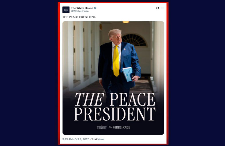 نشر البيت الأبيض  أمس، على منصة “إكس”، صورة للرئيس الأمريكي دونالد ترامب على خلفية الإعلان عن التوصل إلى اتفاق في قطاع غزة، وعلّق عليها بعبارة “رئيس السلام».