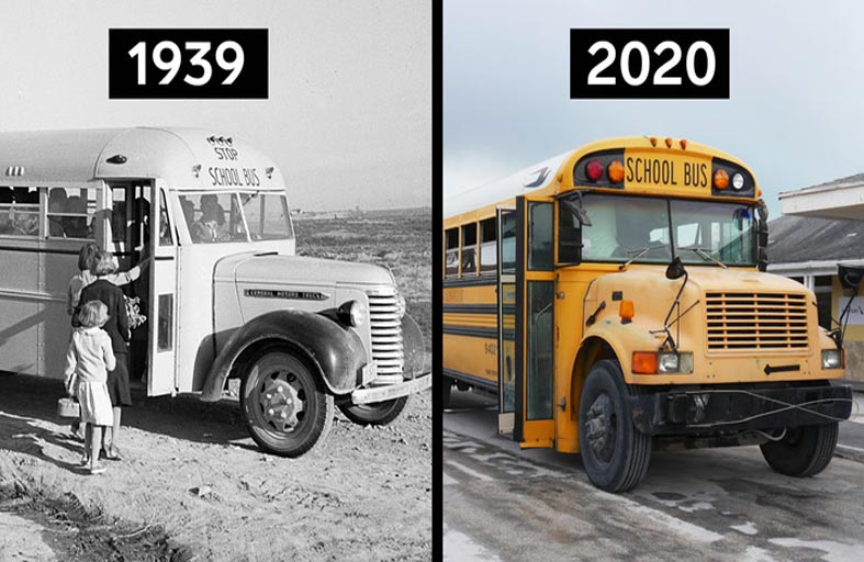 وها هي الحافلات المدرسية بعد 80 عاما، تبدو متشابهة تماما، رغم أن السيارات الأخرى خضعت لإعادة تصميم ضخمة في نفس الفترة الزمنية.