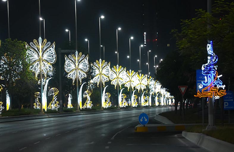 وكعادته في كل مناسبة، سيتم تمييز كورنيش أبوظبي -الوجهة المفضلة لدى سكان أبوظبي وزائريها- بالتشكيلات الهندسية والمجسمات الإبداعية المتميزة التي تأتي على شكل الفراشات وأجنحتها، بالإضافة إلى تمييزه وعدد من الطرق الرئيسية بإضاءة باللون الأصفر المائل إلى اللون الذهبي.